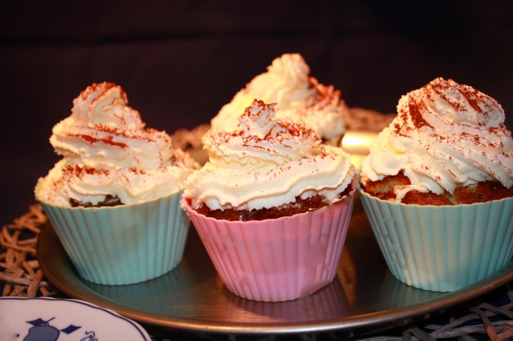 Die Cupcake Förmchen zu je 2/3 mit dem etwas flüssigen Teig füllen. Die Cupcakes im Backofen (Mitte) etwa 25 Minuten backen. Machen Sie vorsichtshalber den Holzstäbchentest. Danach die Cupcakes aus dem Ofen nehmen und auskühlen lassen.