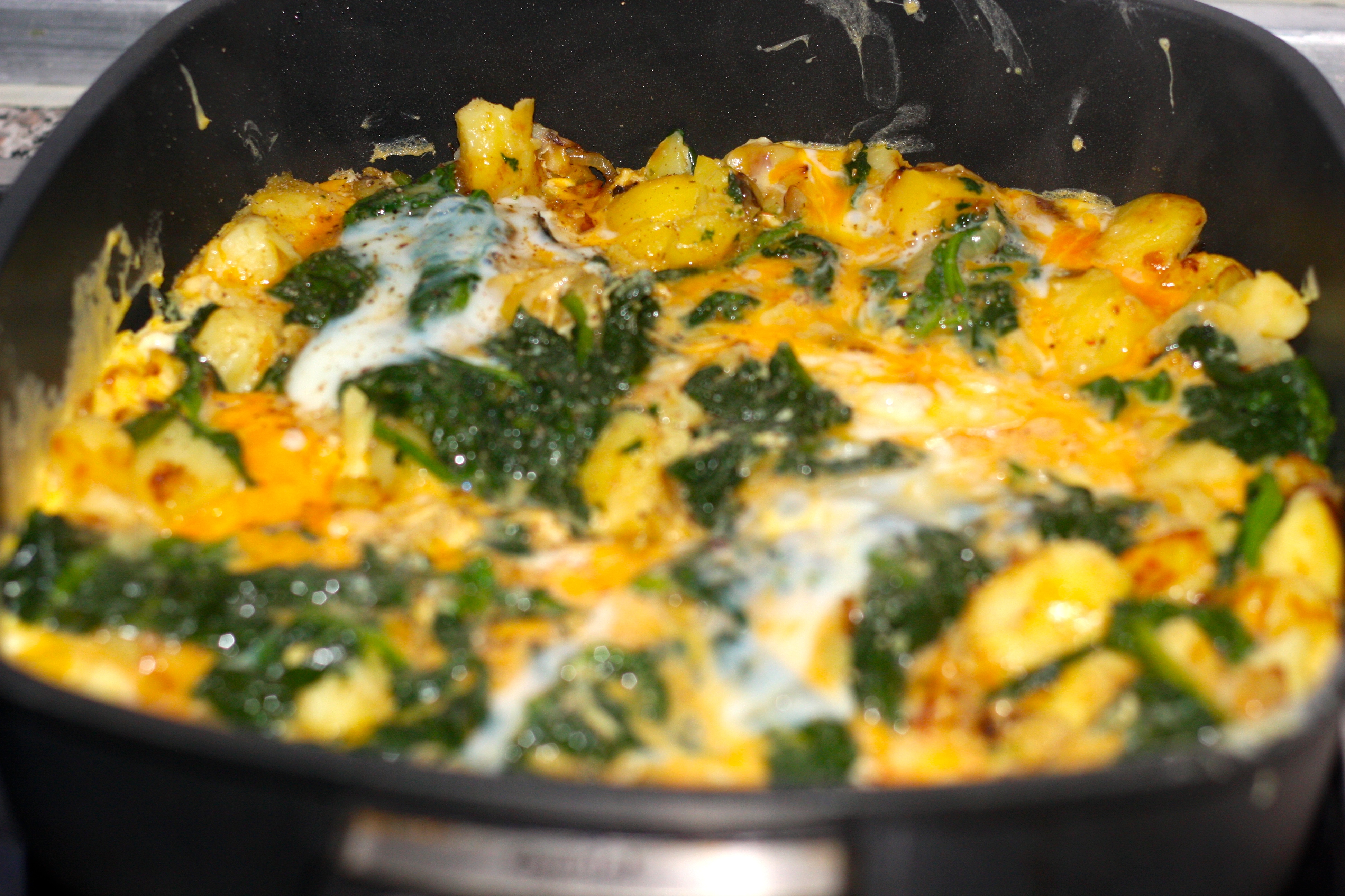 Die Original Gundel Pfanne erhitzen und etwas Öl in die Pfanne geben. Anschließend die Zwiebeln anbraten und die Kartoffeln dazugeben. Den Spinat unterrühren und die Eier verquirlen. Mit Salz und Pfeffer würzen und ebenfalls in die Pfanne geben und stocken lassen.