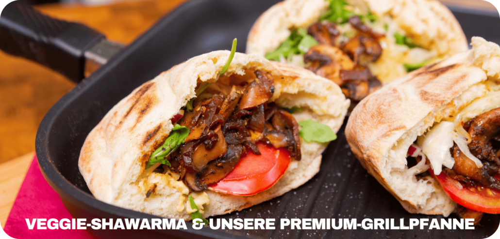 Wenn es auf dem Grill oder Herd richtig aromatisch werden soll, dann ist dieses Rezept genau das Richtige: Pilz-Shawarma im Pitabrot – mit würzigen Champignons, cremigem Hummus und knackigem Gemüse. Perfekt gebraten wird alles in unserer Gundel Guss-Grillpfanne, die durch ihre charakteristische Rillenstruktur nicht nur ein tolles Grillmuster zaubert, sondern auch für fettarmes Braten und intensives Aroma sorgt. Ob auf dem Herd, dem Gasgrill oder im Backofen – mit dieser Pfanne gelingt das Rezept immer.