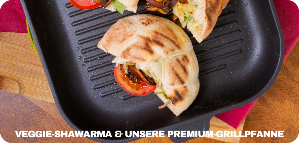 Wenn es auf dem Grill oder Herd richtig aromatisch werden soll, dann ist dieses Rezept genau das Richtige: Pilz-Shawarma im Pitabrot – mit würzigen Champignons, cremigem Hummus und knackigem Gemüse. Perfekt gebraten wird alles in unserer Gundel Guss-Grillpfanne, die durch ihre charakteristische Rillenstruktur nicht nur ein tolles Grillmuster zaubert, sondern auch für fettarmes Braten und intensives Aroma sorgt. Ob auf dem Herd, dem Gasgrill oder im Backofen – mit dieser Pfanne gelingt das Rezept immer.